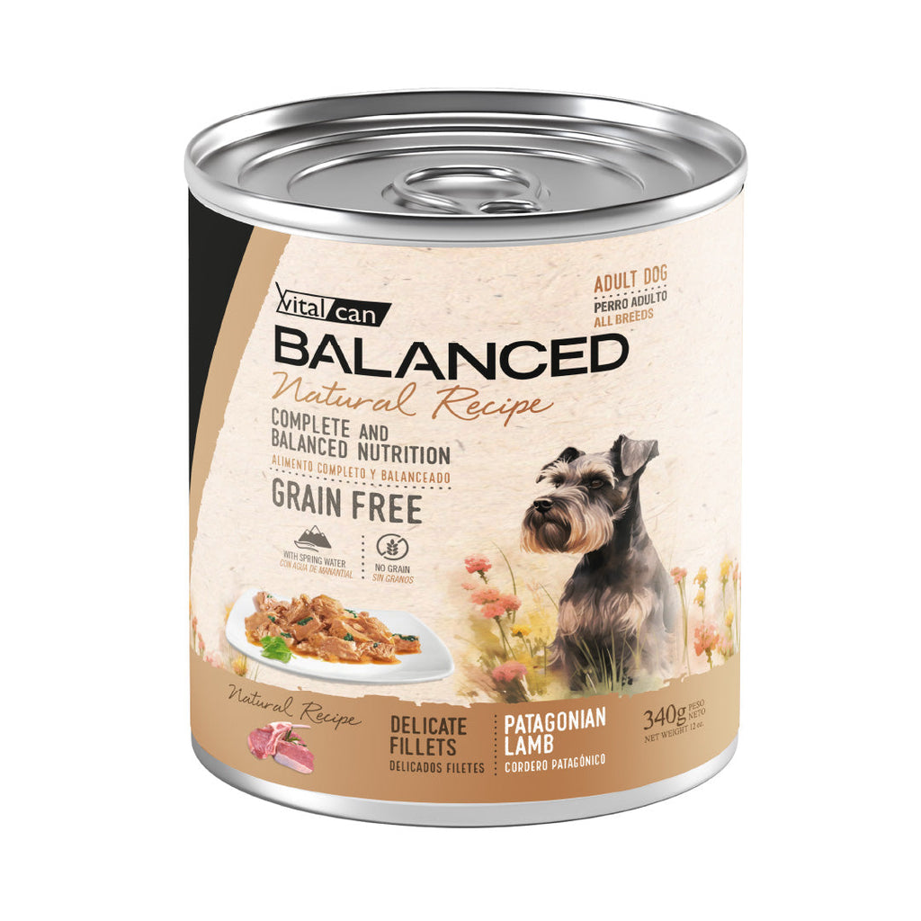 Alimento húmedo en lata marca Balanced Natural Recipe elaborado con cordero para Perros Adultos